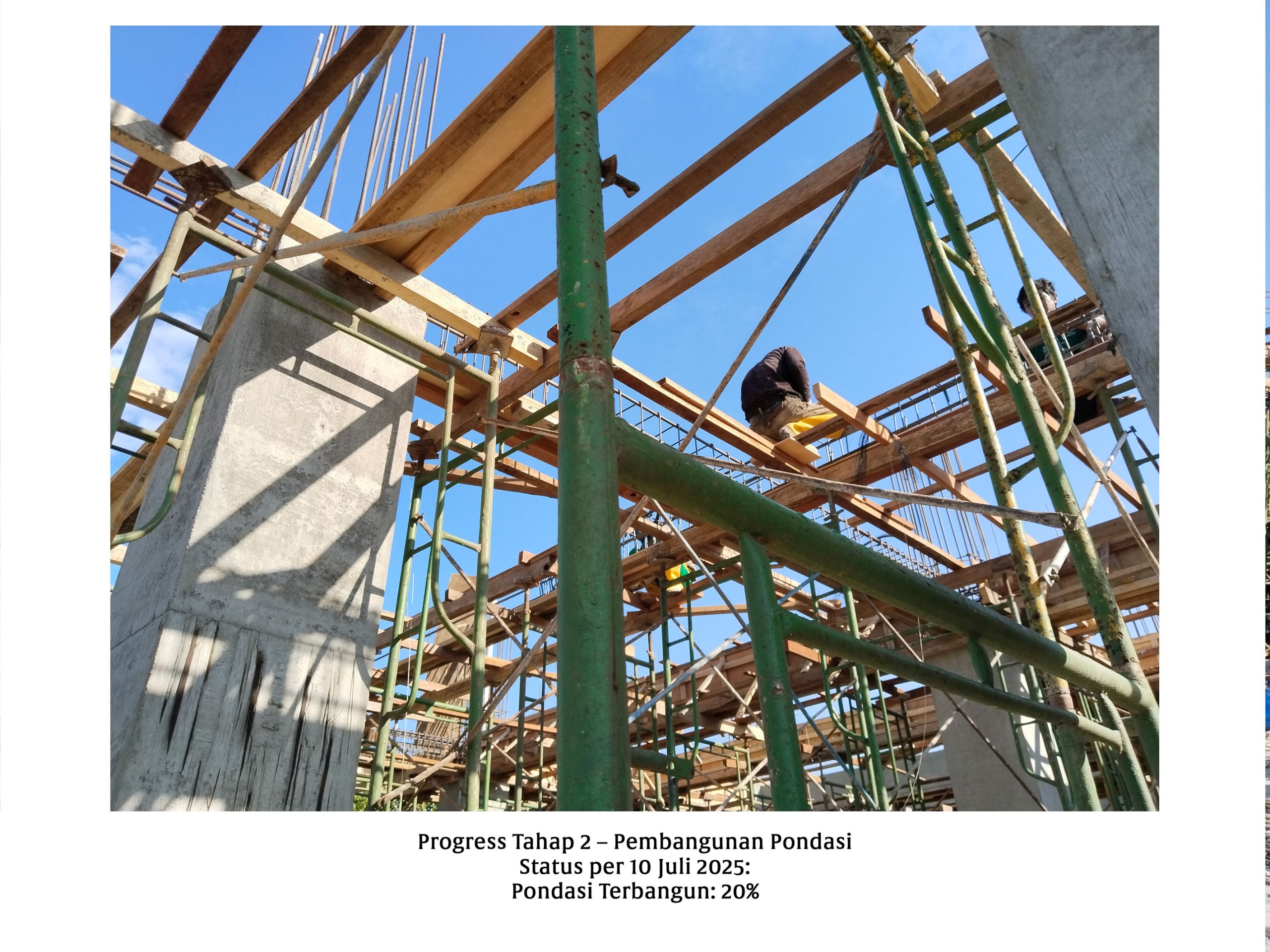 Per Juli 2025, pembangunan telah memasuki Tahap 2 dengan progres pondasi mencapai 20%.