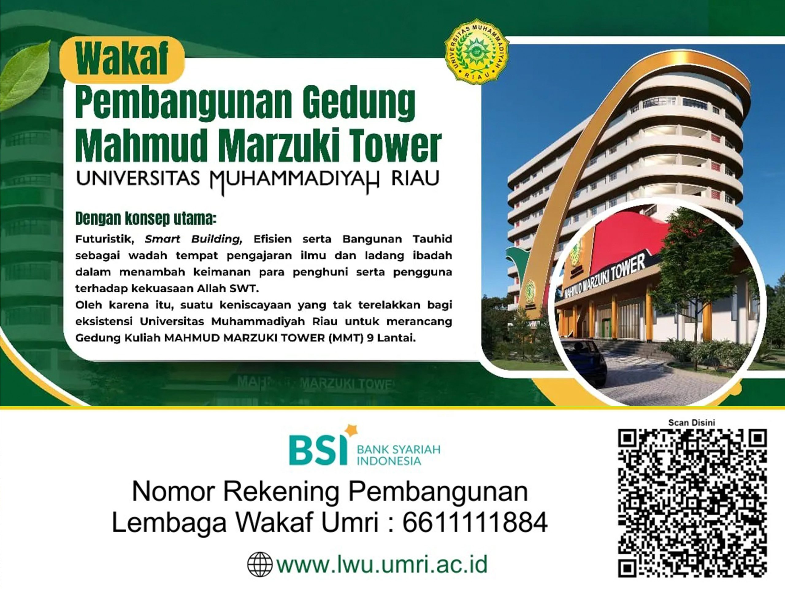 Wakaf Anda bukan hanya mendirikan gedung, tetapi membangun masa depan generasi unggul dan berdampak. Mari bergabung dalam pembangunan Mahmud Marzuki Tower (MMT).